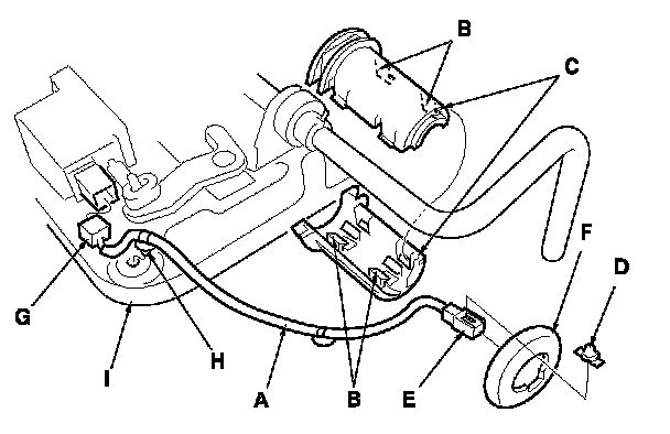 -4 Disconnect the actuator connector (G), and detach the harness clip (H) from the head restraint base (I).