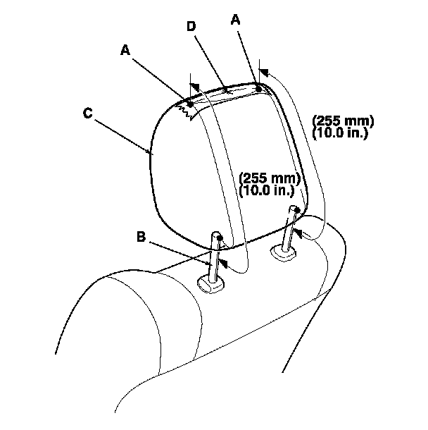 3. Make marks (A) on both sides at 255 mm (10.0 in.) upward from the roots of the head restraint frame (B) along the back of the head restraint (C) surface. Make a center of these points as a datum point (D).
