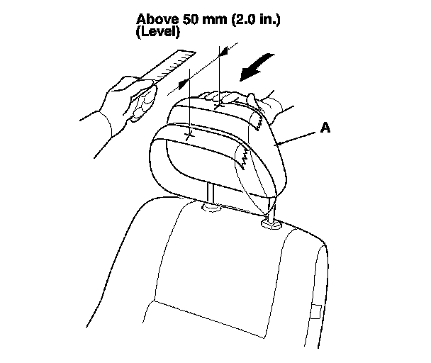 4. Push the head restraint (A) forward, and using a scale, measure the level amount of the head restraint movement. The head restraint should move more than 50 mm (2.0 in.) without resistance. If it is less than 50 mm (2.0 in.), or the head restraint doesn't move smoothly, replace the seat frame. Front Seat Frame Removal/Installation