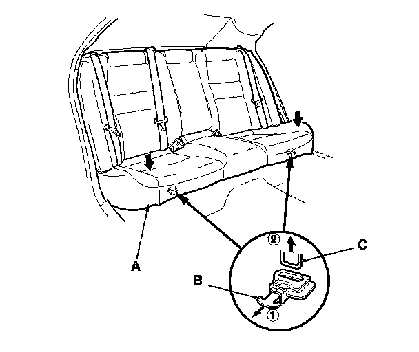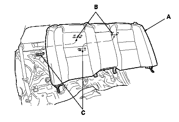 2. Remove the seat cushion (A), and release the center seat belt buckles (B) from their slits (C).