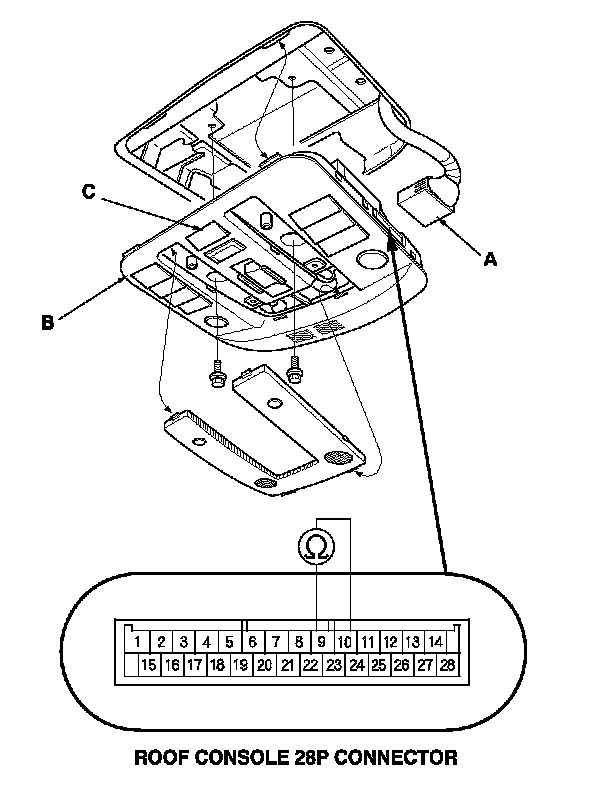2. Disconnect the 28P connector (A) from the roof console (B).