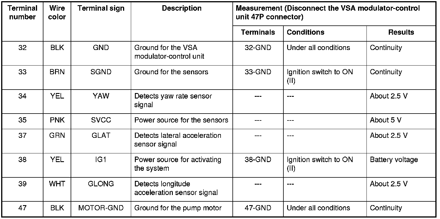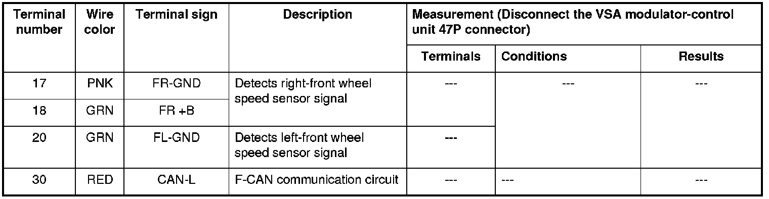 VSA Modulator-Control Unit Inputs and Outputs for 47P Connector (Connector disconnected from the VSA modulator-control unit.) (cont'd)