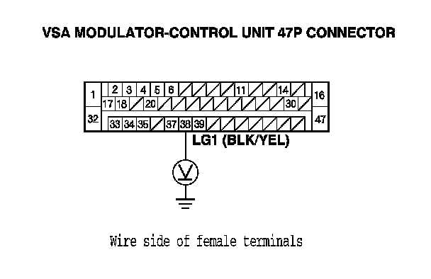 7. Measure the voltage between VSA modulator-control unit 47P connector terminal No. 38 and body ground.
