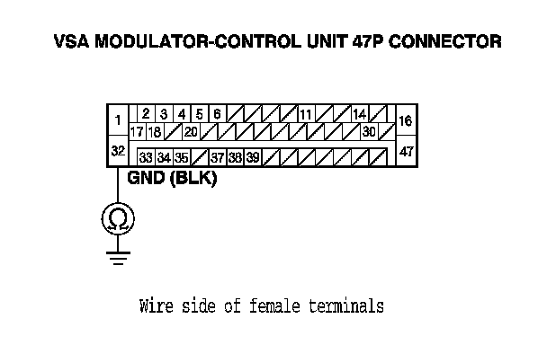 9. Check for continuity between VSA modulator-control unit 47P connector terminal No. 32 and body ground.