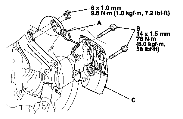 4. Remove the brake caliper bracket mounting bolts (B), and remove the caliper assembly (C) from the knuckle. To prevent damage to the caliper assembly or brake hose, use a short piece of wire to hang the caliper assembly from the undercarriage. Do not twist the brake hose with force.