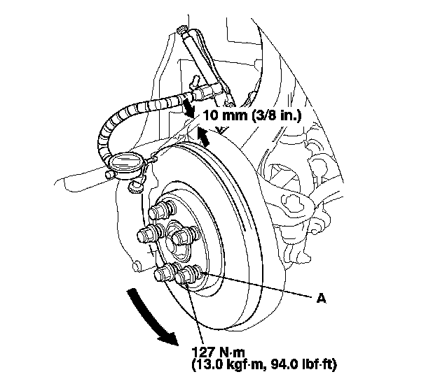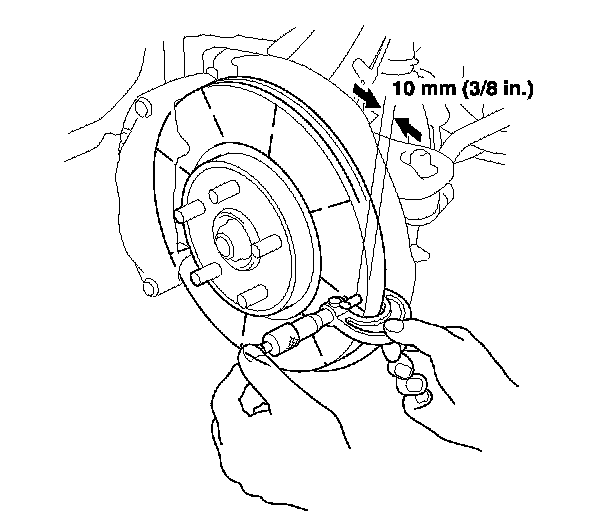 6. Set up the dial gauge against the brake disc as shown, and measure the runout at 10 mm (3/8 in.) from the outer edge of the brake disc.