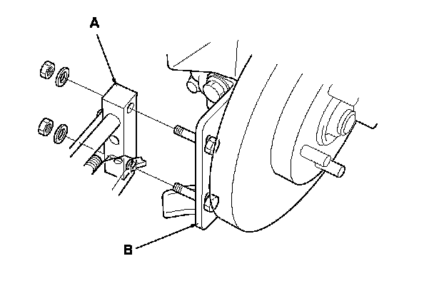 2. Install the brake lathe brackets (A) to the knuckle (B).