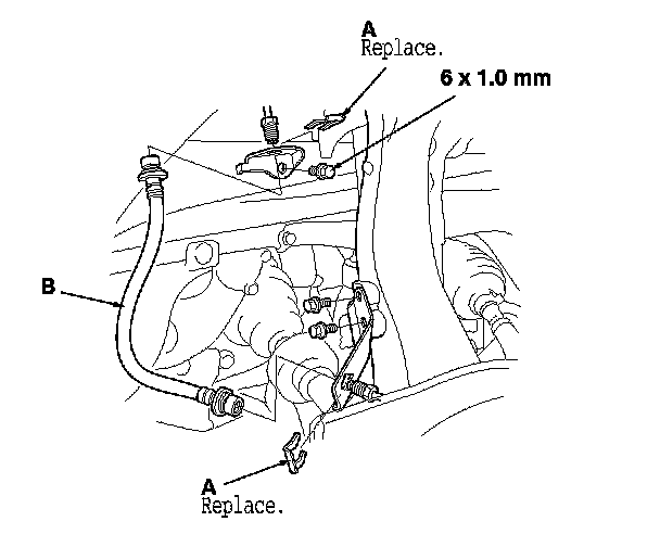 3. Remove and discard the brake hose clips (A) from the brake hose (B).