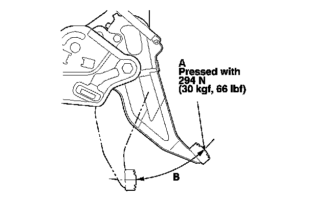 1. Press the parking brake pedal (A) with 294 N (30 kgf, 66 lbf) of force to fully apply the parking brake. The parking brake pedal should be locked within the specified number of clicks (B).