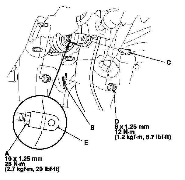 5. Remove the brake booster mounting nuts (D) and the clevis (E).