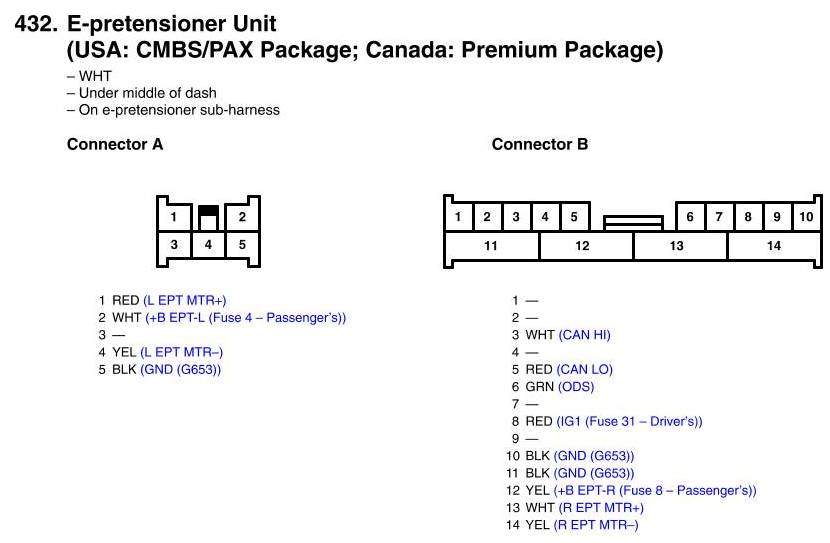 View 432 - E-pretensioner Unit Connector View (USA: CMBS/PAX Package; Canada: Premium Package)