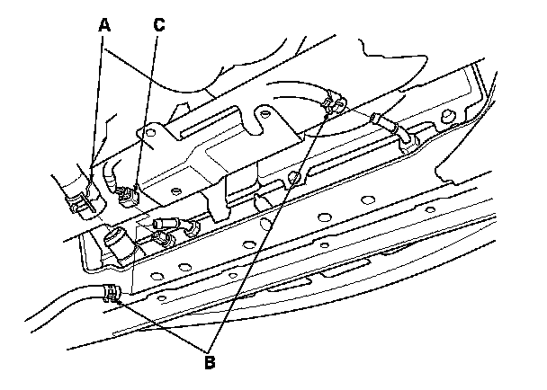 6. Disconnect the automatic transmission fluid (ATF) cooler hoses (B), then plug the hose and line.
