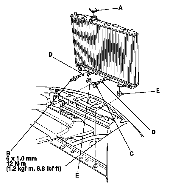 14. Install the radiator. Make sure the lower cushions (E) are set securely.