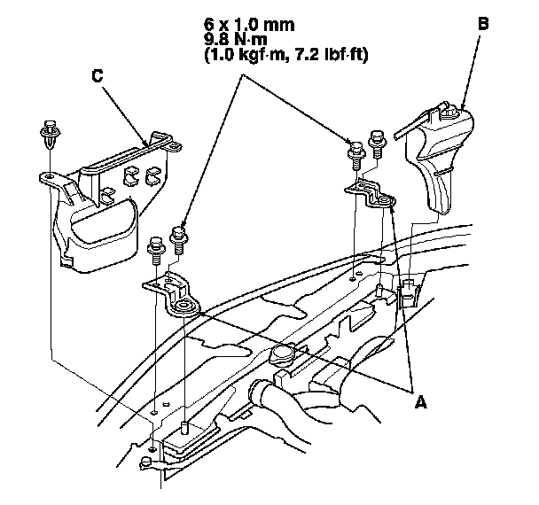 16. Install the radiator upper brackets (A), the coolant reservoir (B), and the air intake duct cover (C).