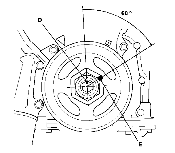 -2 Mark the bolt head (D) and the crankshaft pulley (E) as shown, then tighten the bolt an additional 60 ° (The mark on the bolt head lines up with the mark on the crankshaft pulley).