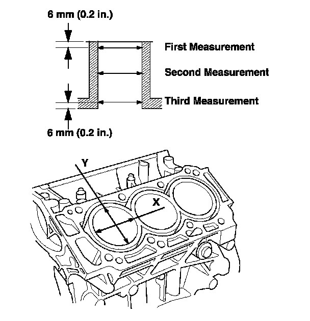 4. Measure wear and taper in direction X and Y at three levels in each cylinder as shown.