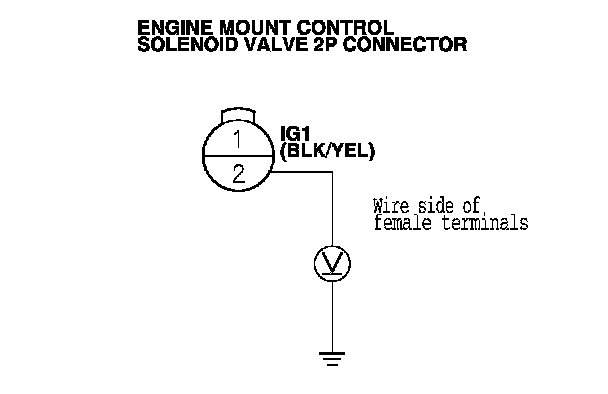 9. Measure the voltage between engine mount control solenoid valve 2P connector terminals No. 1 and No. 2, with the engine at idle.