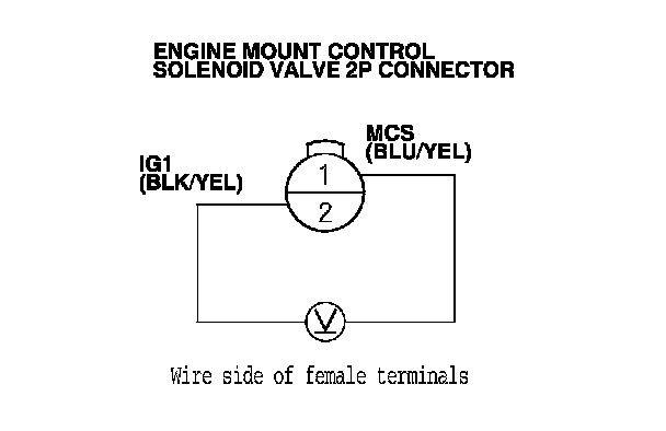 NO - Repair open in the wire between PCM (B7) and the engine mount control solenoid valve 2P connector terminal No. 1. If the wire is OK, update the PCM if it does not have the latest software, PCM Update or substitute a known-good PCM, Initial Inspection and Diagnostic Overview and recheck. If the engine mount control system works properly, and the PCM was updated, the troubleshooting is complete. If the PCM was substituted, replace the original PCM. Service and Repair