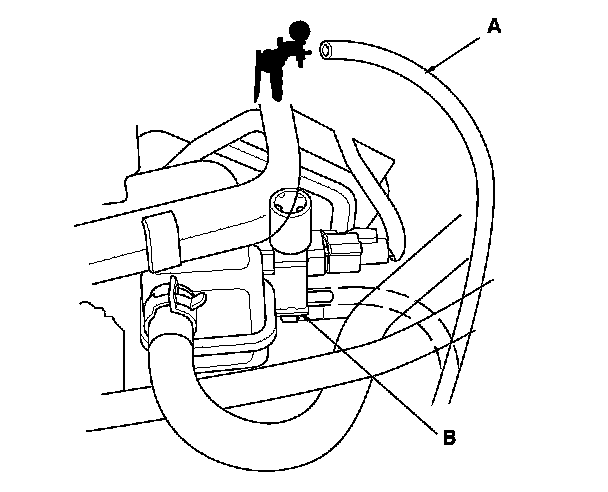 13. Disconnect the vacuum hose (A) from the engine mount control solenoid valve (B), and connect a vacuum pump/gauge, 0-30 in.Hg, to the hose. Apply about 20 in.Hg of vacuum, and wait for 20 seconds.
