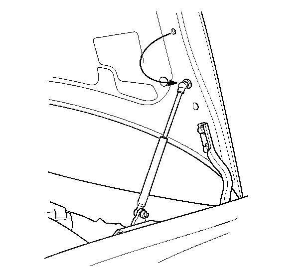 1. Disconnect the support struts from both sides of the pivot ball (bolted to the hood). Secure the hood in a vertical position. Remove the right side pivot ball and install it into the lower threaded hole, then reattach the support strut.
