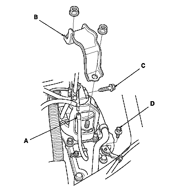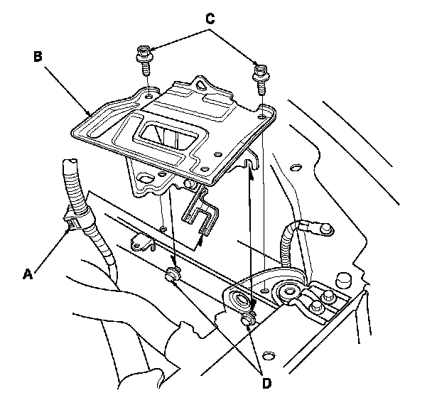 14. Remove the two bolts (D) securing the under-hood fuse/relay box, then remove the under-hood fuse/relay box.