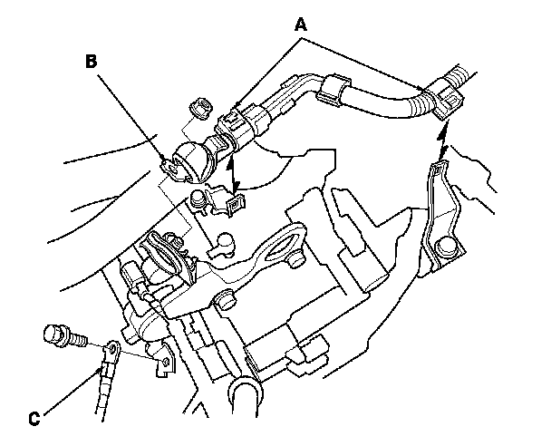 56. Disconnect the vacuum hose (A), then remove the front mount stop (B) and the front mount bolt (C).