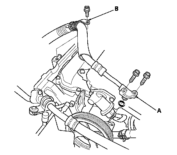 21. Remove the power steering (P/S) pump outlet line (A) from the P/S pump, then plug the outlet line and the P/S pump.