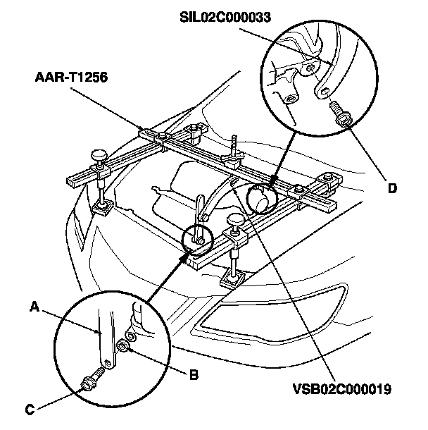 55. Lift and support the engine with the engine support hanger (AAR-T1256) and engine balance bar (VSB02C000019). Attach the front arm (A) to the front cylinder head with a spacer (B) and the 10 x 1.25 mm bolt (C). Remove the rear arm from the balance bar, and install the 2008 V6 attachment arm (SIL02C000033), then attach the 2008 V6 attachment arm to the rear cylinder head with the 8 x 1.25 mm bolt (D).