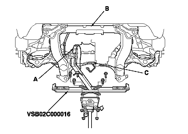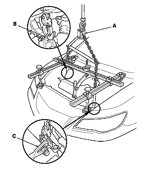 63. Lower the vehicle and attach a chain hoist (A) to the engine hook (B) and transmission hook (C). Lift up the engine/transmission assembly until it's securely supported by the chain hoist. Remove the engine support hanger then the engine balance bar from the engine and vehicle.