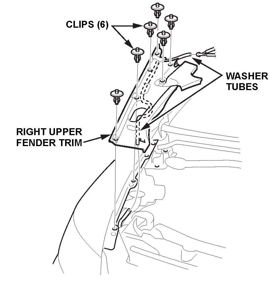 1. Disconnect the washer tubes. Remove the clips, then remove the right upper fender trim.