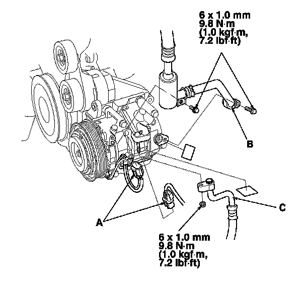 5. Disconnect the A/C compressor clutch connector (A). Remove the bolts and the nuts, then disconnect the suction hose (B) and the discharge hose (C) from the A/C compressor. Plug or cap the lines immediately after disconnecting them to avoid moisture and dust contamination.