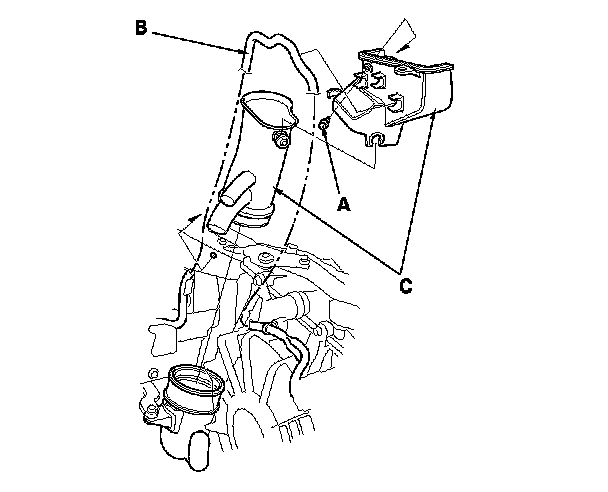 4. Remove the clip (A) and the harness (B), then remove the air intake ducts (C).