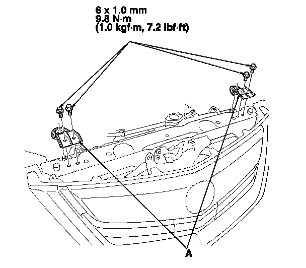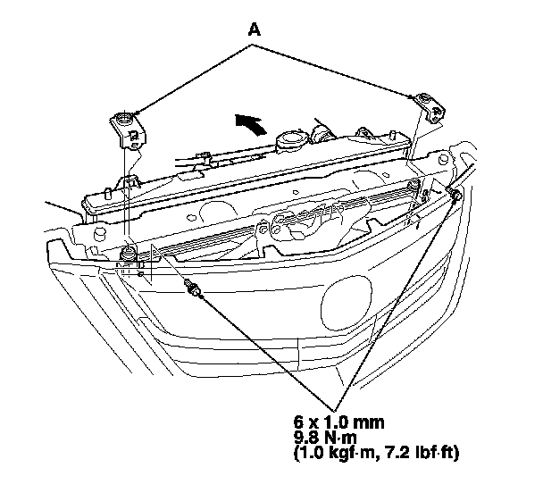 7. Remove the bolts and the radiator upper mount brackets (A).