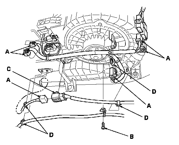 10. Disconnect the connectors (A) from the blower motor, the power transistor, the control motor relay, the throttle actuator control module subharness, and the dashboard wire harnesses. Remove the self-tapping screw (B), the connector clip (C) and the wire harness clips (D).
