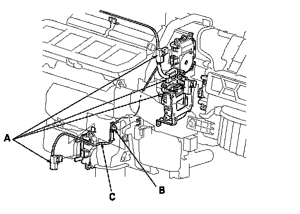 11. Disconnect the connectors (A) from the recirculation control motor, the passenger's cool vent control motor, the passenger's air mix control motor, and the rear vent control motor, and then remove the wire harness clip (B) and the wire harness (C).