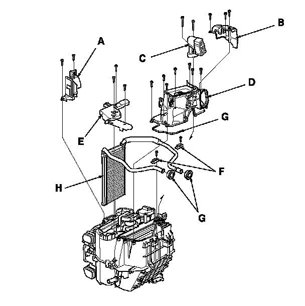 13. Remove the self-tapping screws and the passenger's heater duct (A), then remove the expansion valve cover (B), the bolts, and the expansion valve (C). Remove the self-tapping screws, the joint duct (D), and the heater core cover (E). Remove the self-tapping screws, the heater pipe brackets (F), and the grommets (G), then carefully pull out the heater core (H).