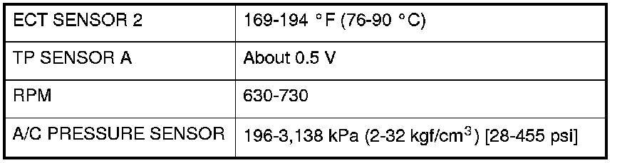 6. Using the HDS, confirm the following values in the PGM-FI Date List at idle.