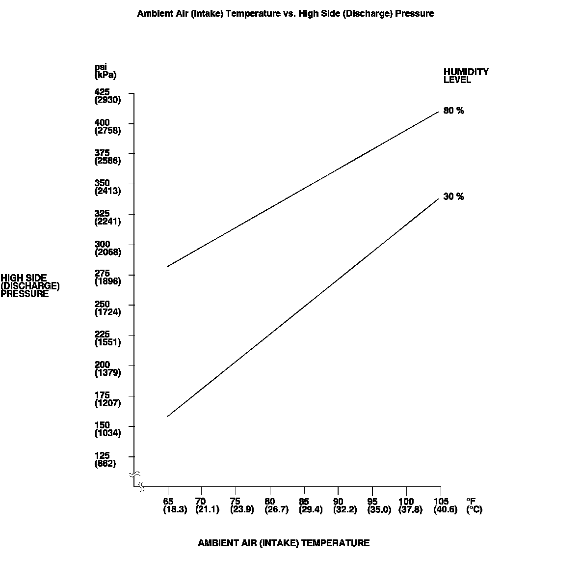 NOTE: The high side pressure and the ambient air temperature should intersect in the shaded area. Any measurements outside the area may indicate the need for further inspection.