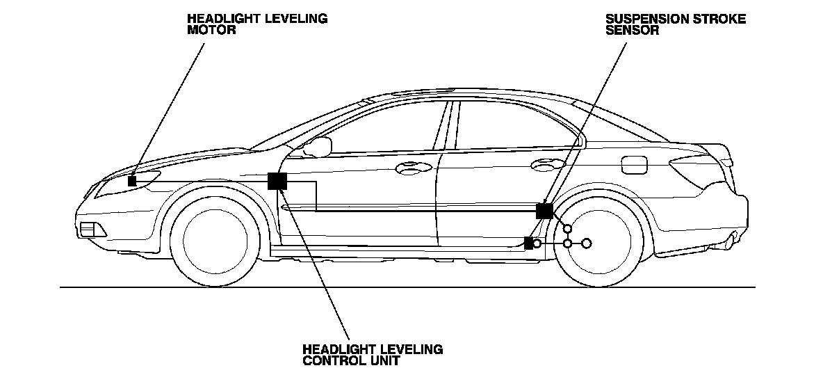 The headlight leveling system is composed of the headlight leveling control unit, the suspension stroke sensor, and the left and right headlight leveling motors.
