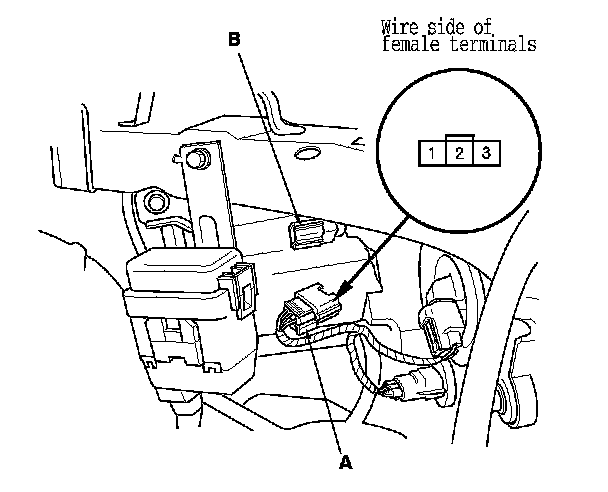 1. Disconnect the 3P connector (A) from the headlight leveling motor (B).