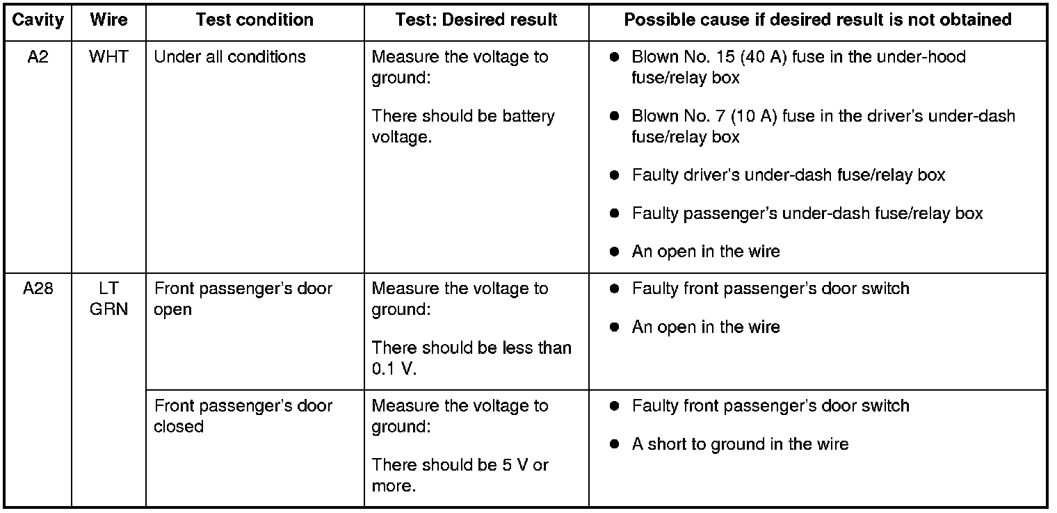 18. Reconnect the connector to the front passenger's MPCS unit, and do these input tests at the connector.