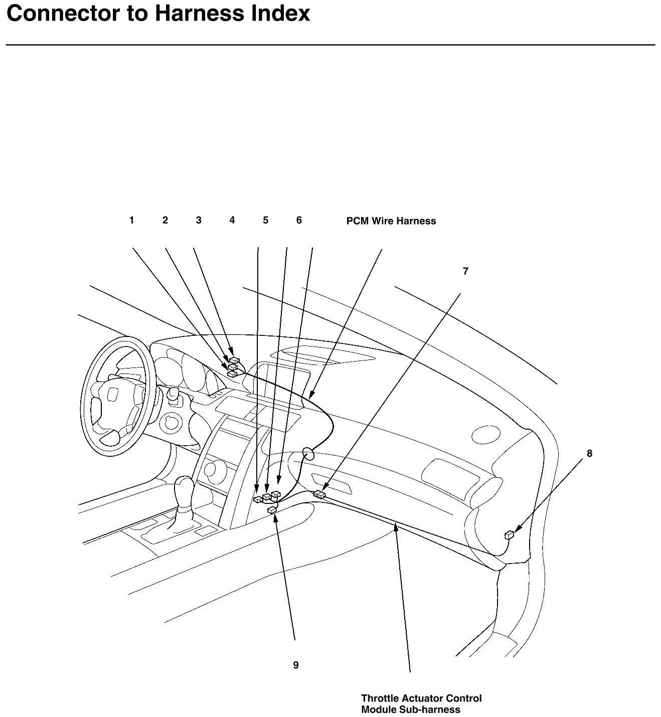 PCM Wire Harness and Throttle Actuator Control Module Subharness Connector and Harness Locations