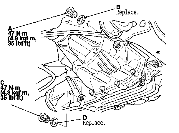 3. Remove the drain plug (C) and the sealing washer (D), and drain the fluid.