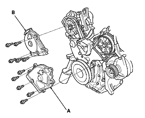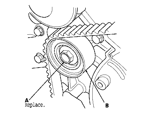 16. Remove the idler pulley bolt (A) and the idler pulley (B), then remove the timing belt. Discard the idler pulley bolt.