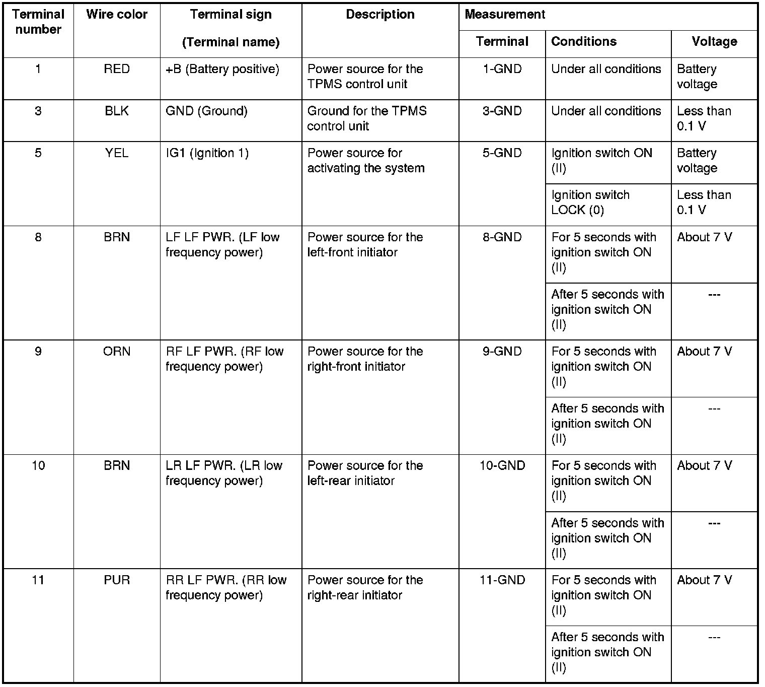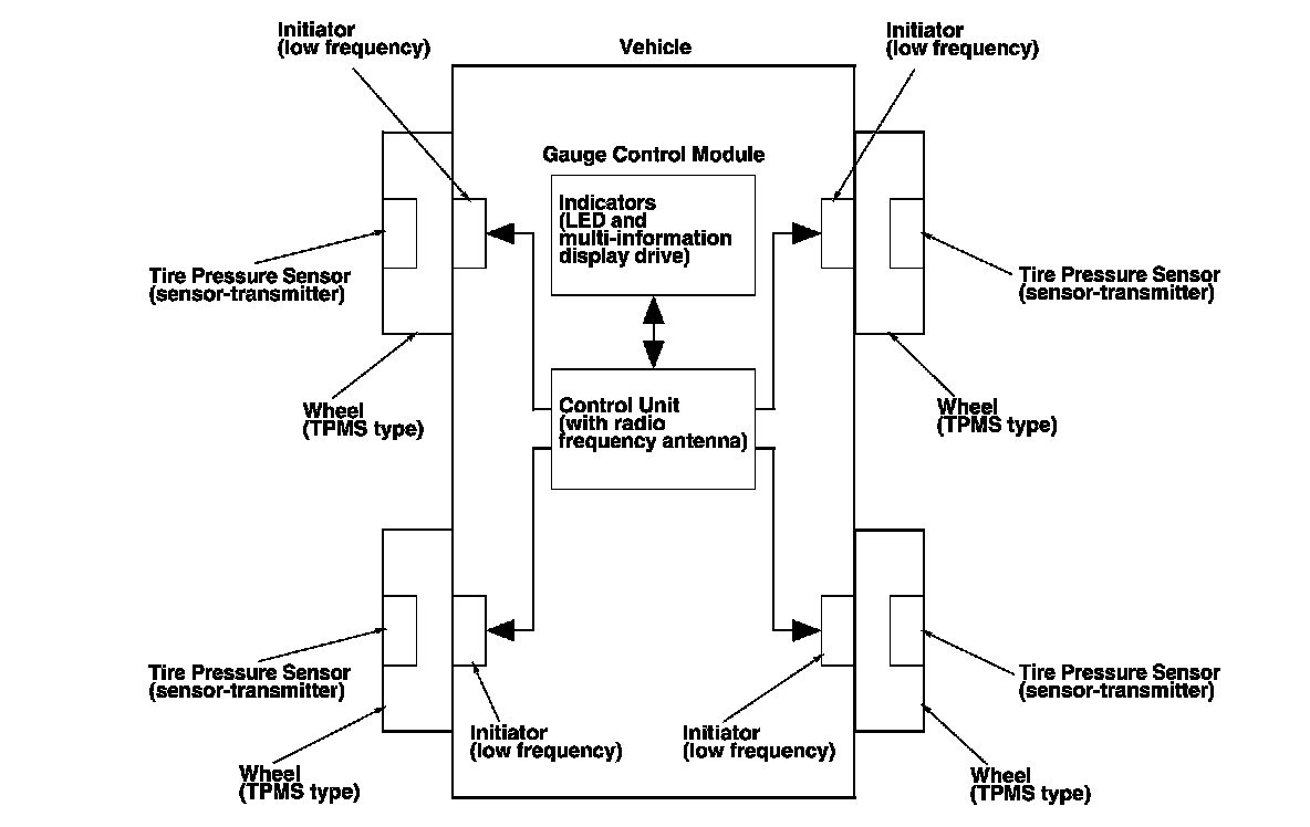 - An ID can be memorized manually or automatically. Each initiator is hardwired to the control unit. Every time the ignition is turned to ON (II), the control unit asks each initiator to wake up the appropriate tire pressure sensor. The transmitters in the tire pressure sensors then transmit the sensor IDs, and the control unit receives and memorizes them. The control unit then knows which ID belongs to each tire location. This recurring ID confirmation prevents any confusion in the system as a result of normal tire rotation.
