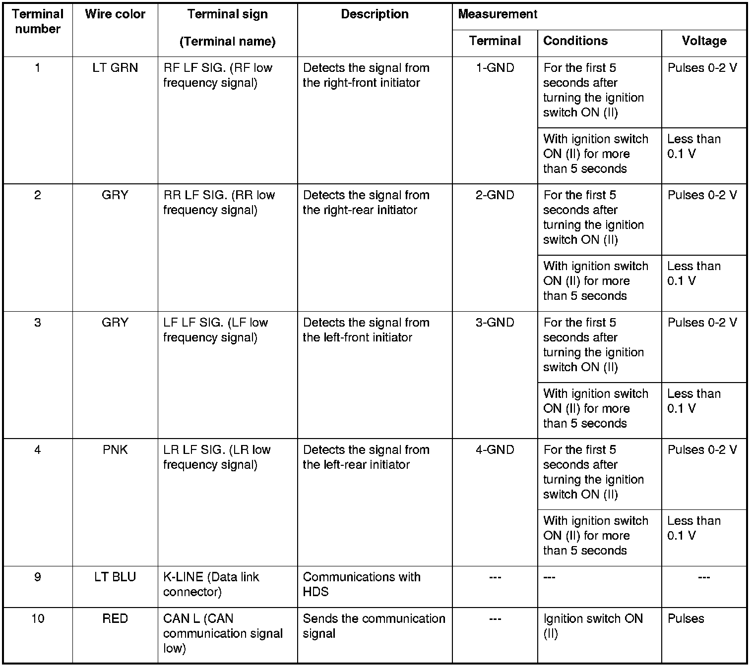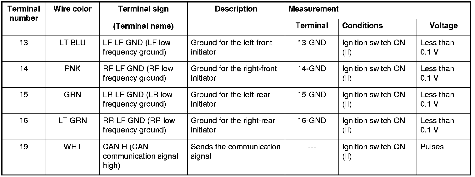 - When the ignition switch is turned to ON (II), the initiators send a LF (low frequency) band wave signal to the low pressure sensors, switching them from sleep mode to normal function mode. When the ignition switch is turned to LOCK (0), the sensors switch from normal function mode back to sleep mode to extend their battery life.