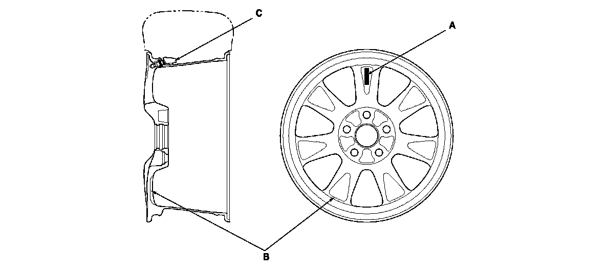 TPMS will not work unless TPMS type wheels are installed on the vehicle. The original equipment wheels have a "TPMS" mark on them (A), and a counterweight (B) cast into the opposite side of the spoke to balance the weight of the sensor (C).
