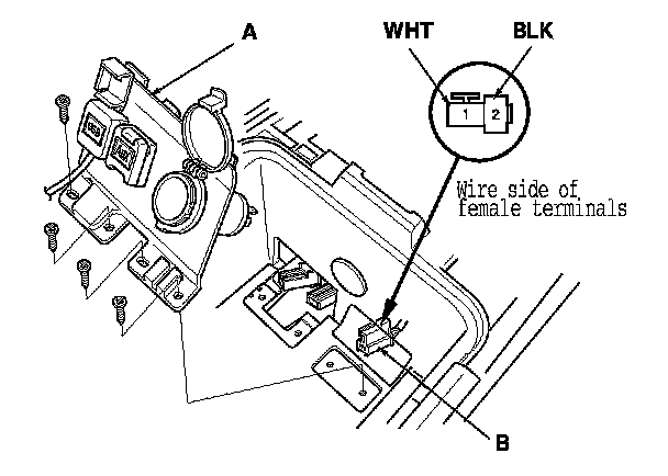 3. Inspect the 2P connector (B) terminals to be sure they are all making good contact.