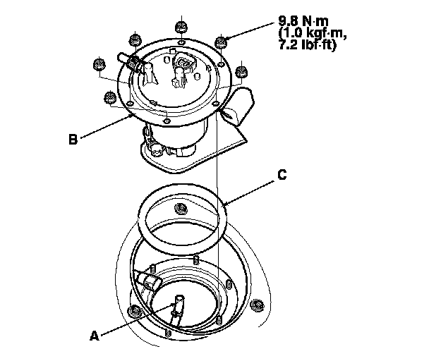 2. Install the fuel tank unit (B) in the reverse order of removal with a new base gasket (C).