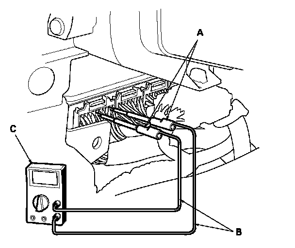 3. If you cannot get to the wire side of the connector or the wire side is sealed (A), disconnect the connector and probe the terminals (B) from the terminal side. Do not force the probe into the connector.